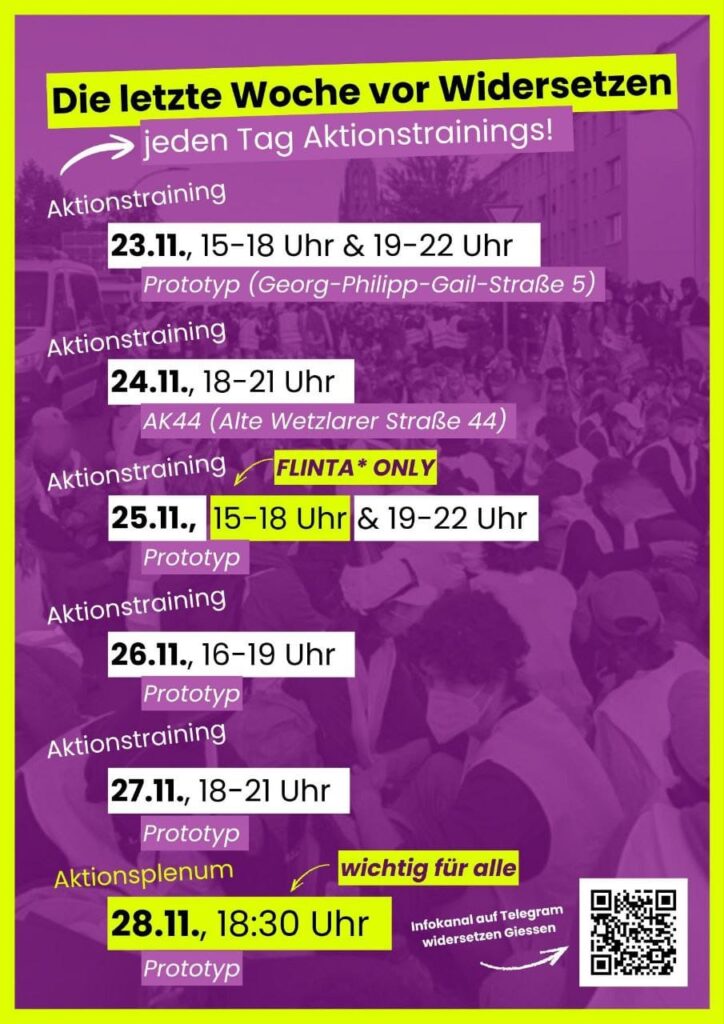 Aktionstrainings sind für widersetzen Aktionen unerlässlich, aber auch für Demo und Kundgebung sinnvoll, um gut auf den 29.11. vorbereitet zu sein! 🚨